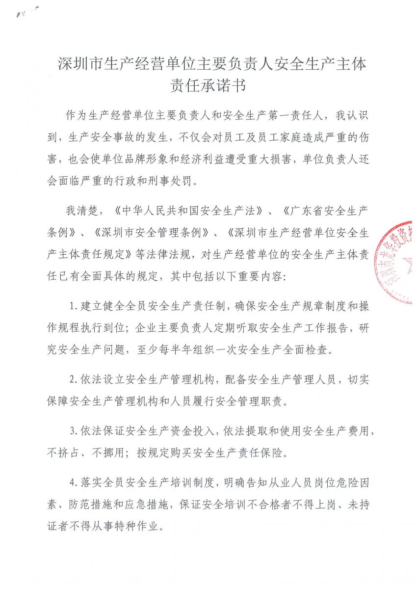 《深圳市生产经营单位主要负责人安全生产主体责任承诺书》公示